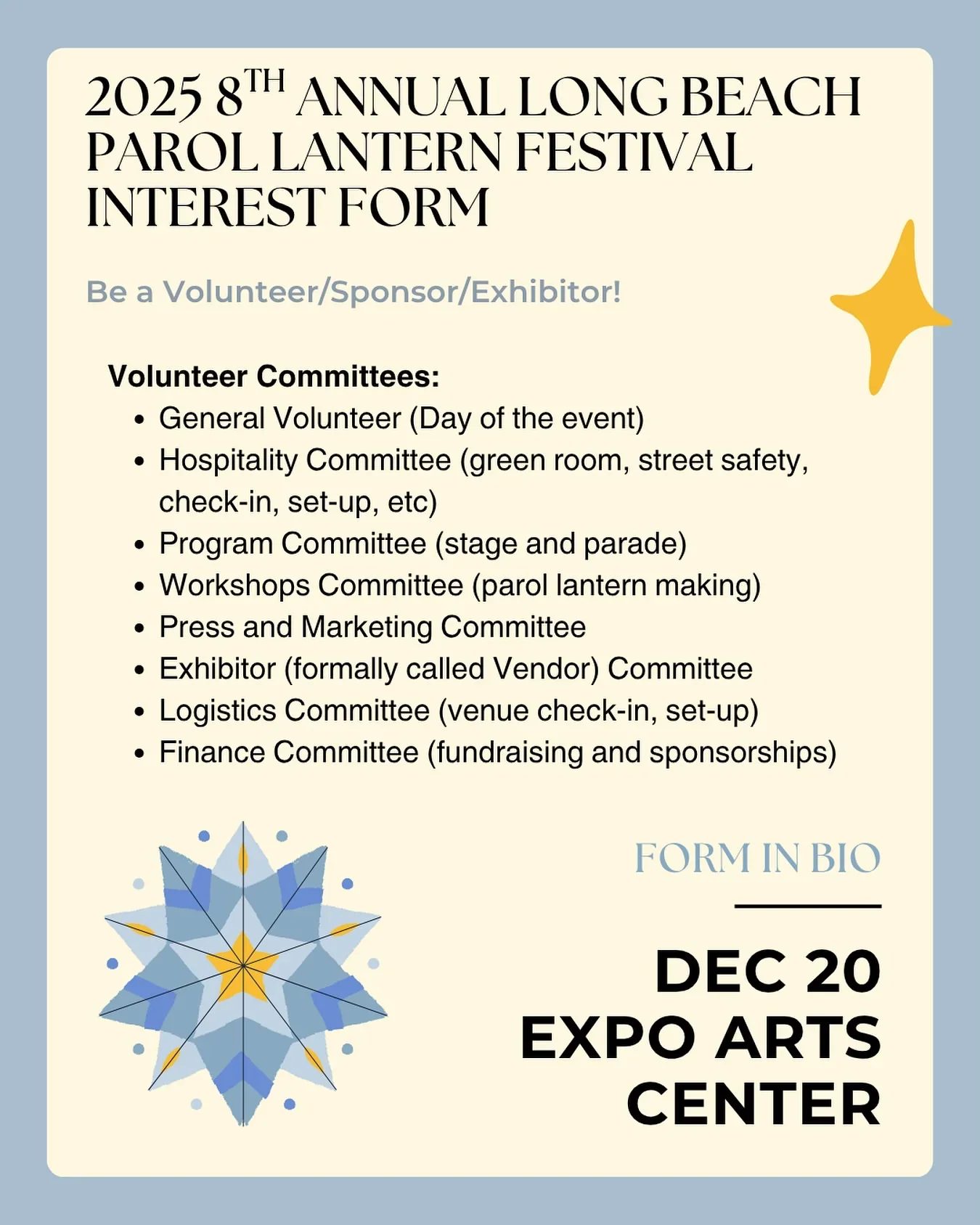 The 8th Annual Long Beach Parol Lantern Festival will showcase the Filipino culture, small businesses, and multiple crafting workshops to create parol lanterns. Attendees are encouraged to display their star-shaped creations in the event’s parol showcase for a chance to earn prizes. This FREE community celebration will take place in Bixby Knolls at Expo Arts Center (4321 Atlantic Ave, Long Beach, CA 90807).